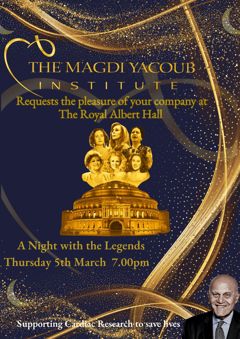 The evening will commence with a private pre-concert reception at 7.00pm, where guests will learn about the vital research Professor Sir Magdi Yacoub and his team. whose work has transformed cardiac care and brought hope to millions of families across the Middle East and around the world.